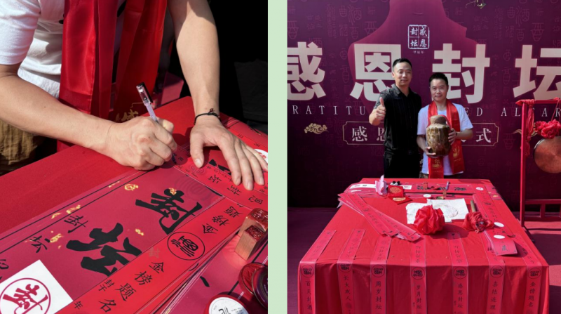 活动现场,每一位参与封坛酒仪式的客户脸上都洋溢着幸福的笑容。他们亲手写下自己的祝愿,印上自己的祝福,并将这美好的祝福,融入美酒之中,储于良窖之内,就此种下对美好生活的期望,随着锣鼓敲响,封坛仪式正式完成。