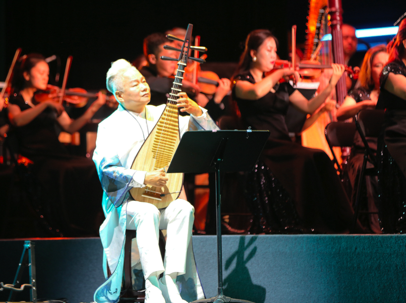 ·国乐艺术家方锦龙在盛典现场演奏五弦琵琶。(库车市融媒体中心 蔡蔬 / 摄)