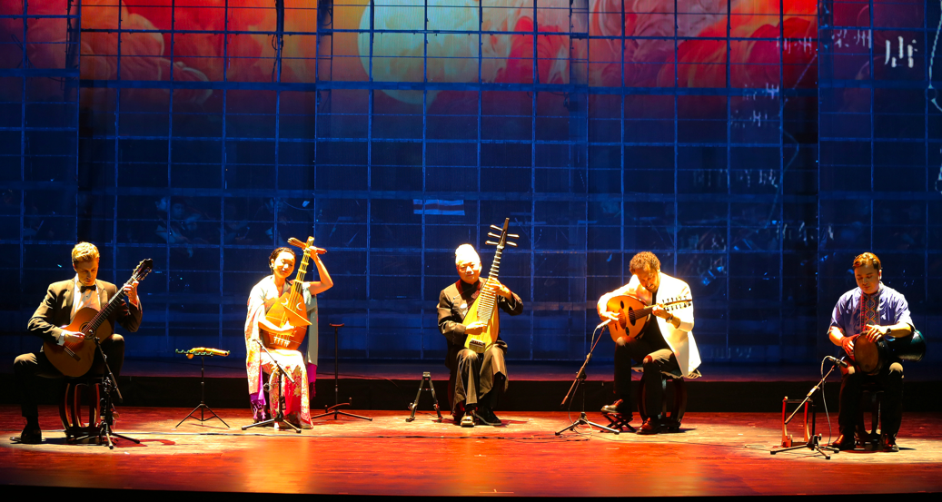 ·方锦龙(中)与荷西·路易斯·莫利亚斯(左一)、长须与佳(左二)、纳瑟尔·沙玛(右二)、伊卜拉伊木·巴拉提合奏《库车丝路行》。(库车市融媒体中心 蔡蔬 / 摄)