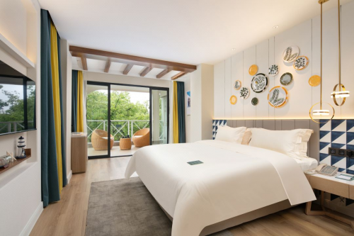 欧暇·地中海酒店作为锦江全球创新中心(GIC)精心打造的首个创新酒店品牌,它以浓郁的地中海风情为特色,通过蔚蓝的海岸、白色的沙滩、金黄的向日葵花田、深棕色的树木和橄榄绿色的“天堂之果”等元素,营造出一个仿佛置身“地中海”的度假环境。酒店巧妙地运用地中海建筑设计灵感,如拱门、陶艺、藤编和空中花园等,打造出一个立体的异域风情空间。