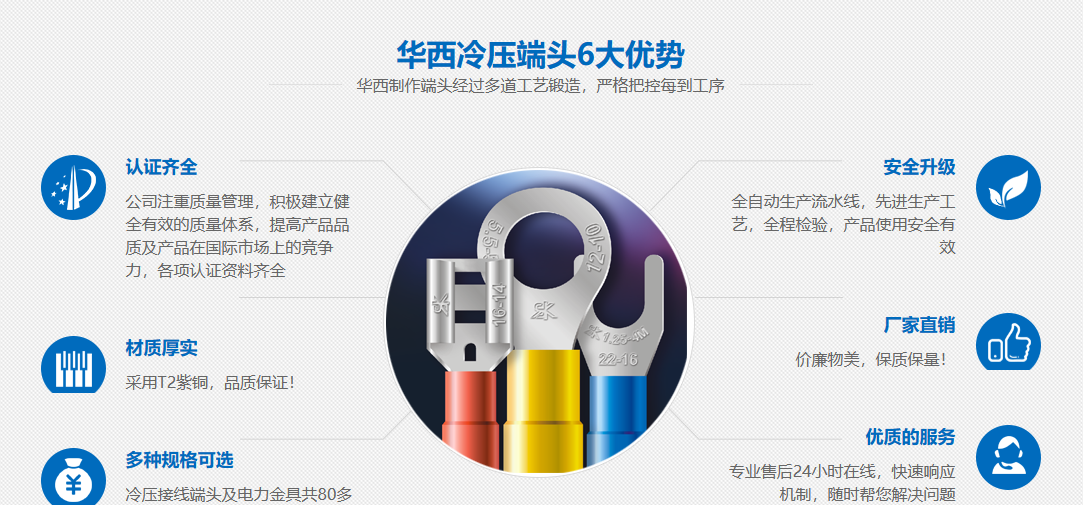 公司生产的冷压接线端子(亦称端子)、接插件、电力金具共80多个系列,4000多个品种,产品广泛应用于核电工业、电力、冶金、机械、化工、造船、铁路等领域。公司始终以创新为原动力,每年提取销售收入3% 以上用于技术创新和研发投入,先后引进台湾先进生产设备及工艺,参照美国、日本、德国等先进工业国家的技术标准,产品经国家电控配电设备质量监督检验中心检测合格,产品技术性能符合国家行业JB/T2436.2-97标准、日本JISC-2805、德国DIN46234标准。