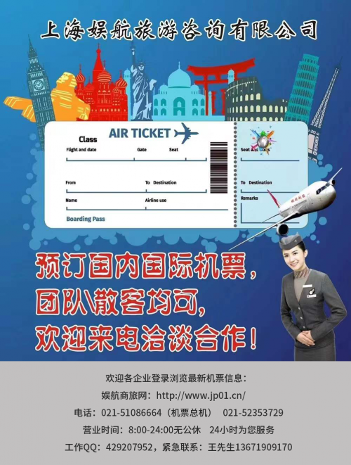 上海娱航旅游咨询有限公司成立于2010年,是一家专业从事国内、国际机票预订 (特价机票、打折机票)一站式旅游机票酒店咨询平台,公司拥有一支优秀团队,细心为客户提供服务,致力于打造中国最大、最专业的机票、特价机票、打折机票、国际机票企业。拥有庞大的服务网点,公司高覆盖、高效率的服务获得多家公司和机构的认可,将以最专业的精神,为您提供安全、经济、专业的服务。