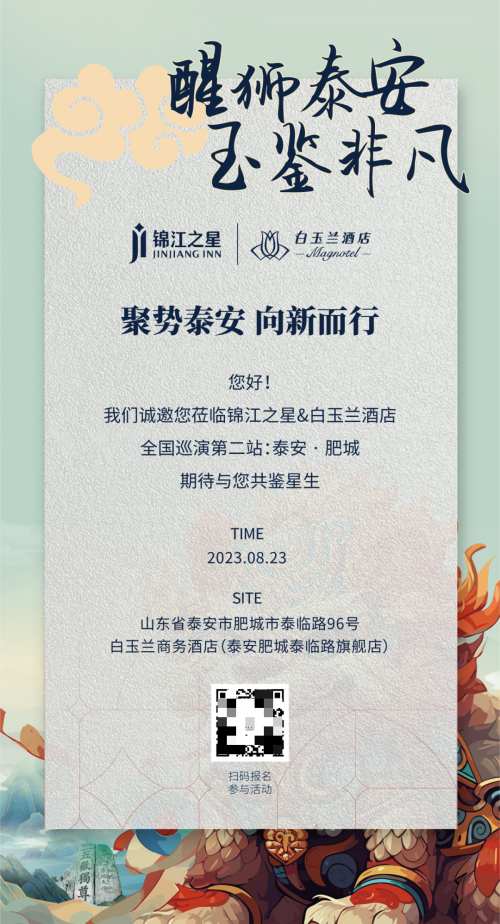 品牌巡演会将于2023年8月23日在白玉兰商务酒店(泰安肥城泰临路旗舰店)举行,巡演会将继续以醒狮为主题,并齐聚双品牌资深投资人,从多维度剖析当下酒店业市场现状,畅谈锦江之星&白玉兰酒店未来发展方向,开创投资新视角,投资干货满满,持续为资深投资人们赋能,敬请期待!
