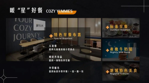与此同时,升级优化锦江之星早餐,呈上暖“星”好餐,早餐是锦江之星品牌27年来的特色和亮点,在经济型行业内独一家地提供超25款以上的出品,锦江之星COZY5.0在传承早餐出品的基础上,提供“Special Breakfast”,在特定城市或节日举办特色早餐stand,在儿童餐饮、特色餐食、用餐模式等方面全面升级,获得了消费者的认可。真诚可靠的运营态度、不断优化的运营模式让盈利模式多元化成为现实,锦江之星增值溢价成效显著,为投资人和业主带来更大的收益。