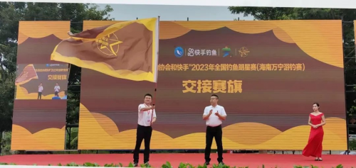 国家体育总局社会体育指导中心社会体育指导员工作部、中国钓鱼运动协会秘书长苏宝生和万宁市旅文局局长姚旺交接赛旗。