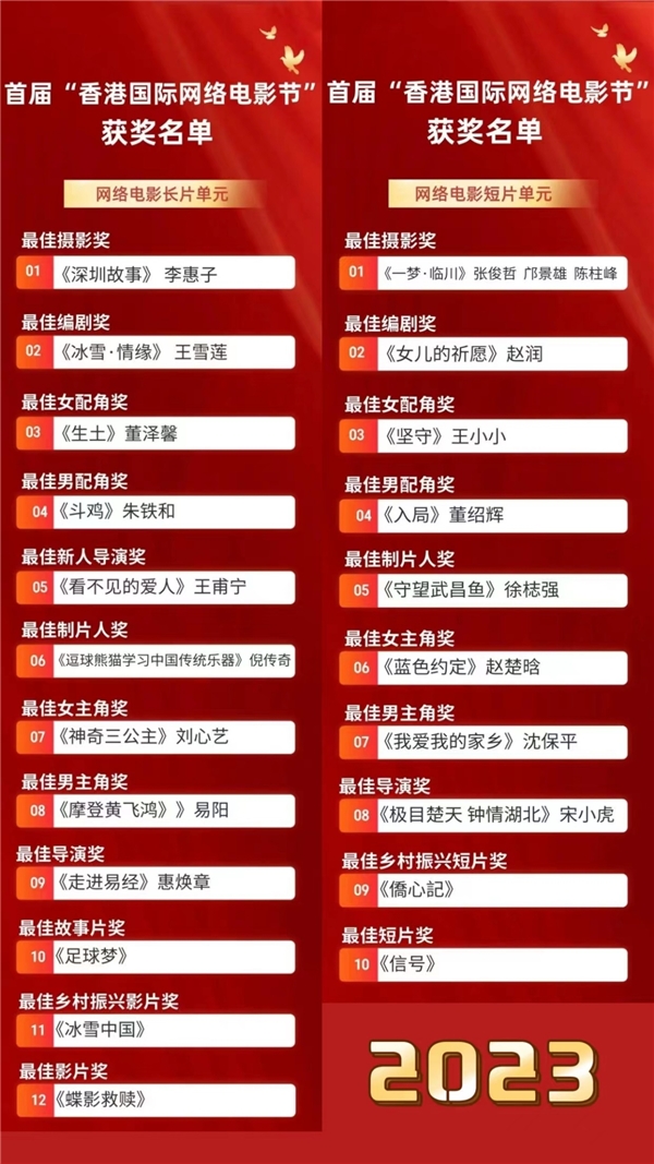首届“香港国际网络电影节”是经由香港特别行政区政府相关部门批准成立,香港国际电影协会、香港国际网络电影节协会主办。是新媒体网络领域内最权威、最专业的电影节品牌。自2023年3月起,面向全球共征集了459部影片,初步入围126部影片,最终入围70部影片,参与角逐网络电影香江奖各单元的奖项。香港国际网络电影节鼓励高质量的影片,优秀的制作团队来参加电影节,共同促进中国电影事业的繁荣发展,汇聚世界电影优秀成果,推进国际电影交流合作。