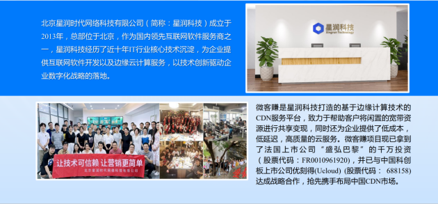星润科技董事长,微客赚创始人—赵科(赵总)介绍到:微客赚项目是星润科技推出的基于边缘计算技术的CDN服务平台。这个平台通过挖掘客户的闲置宽带资源,为企业提供低成本、低延迟、高质量的云服务。同时,它还通过免费赠送并成功安装给每个家庭的方式,协助总部快速抢占终端家庭边缘节点,并通过无限量提供设备给区域合伙人按约定的成分比例分润,享受长期分润,实现躺赚。这种商业盈利模式创新性地实现了客户、企业和星润科技的三方共赢。微客赚项目的推出,展示了星润科技在CDN服务领域的领先地位和创新实力,有望为行业带来更多的惊喜和变革,星润科技在边缘计算领域的技术实力和创新实力为它赢得了国际市场的广泛认可,与UCloud和盛弘巴黎的合作进一步巩固了其在行业中的领先地位。这种强大的合作关系的建立将为星润科技的持续发展提供强有力的支持。