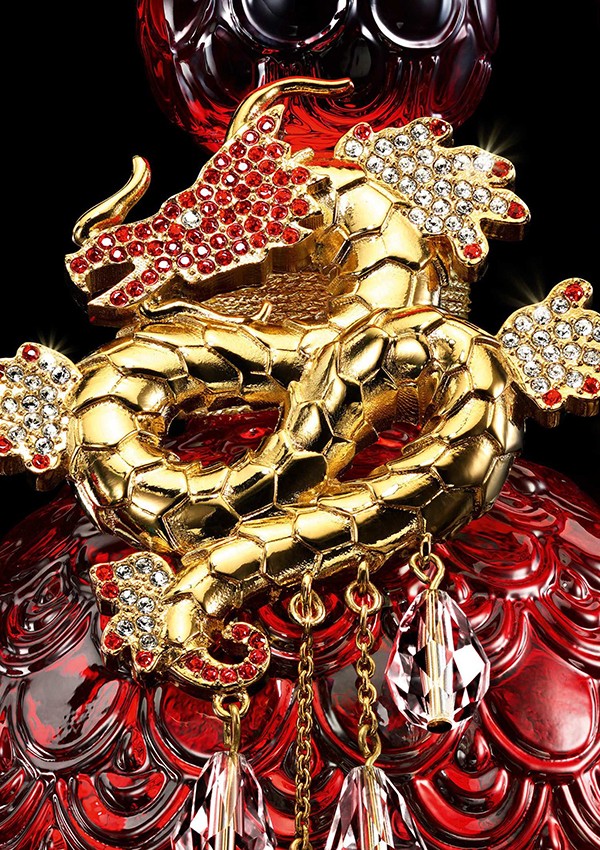 华美的镀金龙为这款红色蜂印瓶注入了灵气,使其更加光彩夺目。这条龙由 Francesco Truscelli 设计,以 24K 金镀金,点缀 142 颗闪亮的施华洛世奇® 水晶,并延绵着一串刻面水晶拖尾。