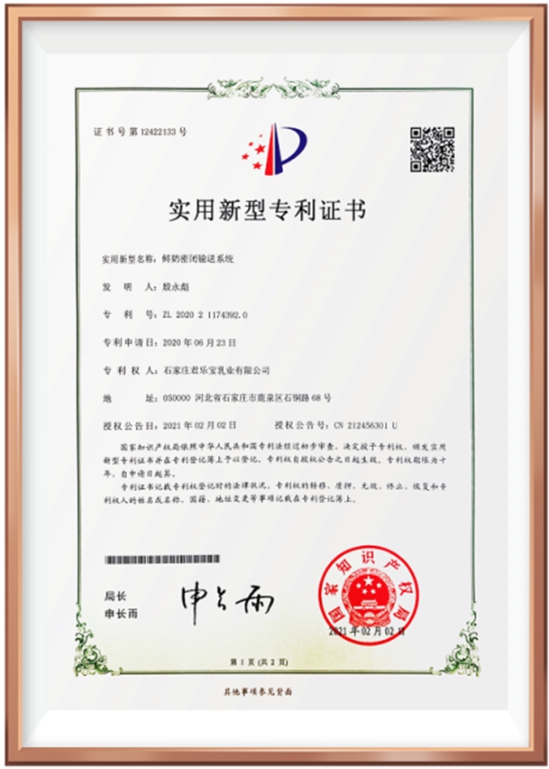 旗帜奶粉“鲜奶密闭输送系统” 国家专利技术证书