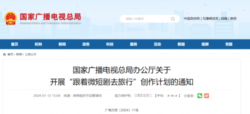 2024年01月12日国家广播电视总局办公厅发布了关于开展“跟着微短剧去旅行”创作计划的通知。提出了总目标,将在2024年,创作播出100部“跟着微短剧去旅行”主题优秀微短剧,并提出了8个创作方向。