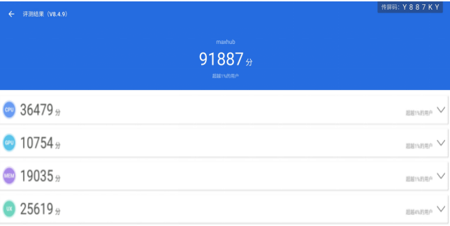 为了更直观比较二者性能差别,我们分别针对皓丽企业版和maxhub V6新锐版进行了安兔兔专业的跑分测试。测试结果如下: