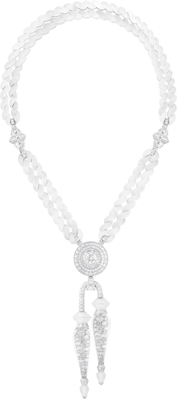 如同一件水晶编织的艺术杰作,这条项链是对针织品中人字纹理的焕新演绎,彰显世家将高级定制时装元素融入珠宝设计的悠久渊源。为实现这一独特设计,每种材质皆使用喷砂工艺,并经由镍钛合金线巧妙相连,精心呈现出一条五圈式项链。整条项链由钻石交错相连,仿佛由水晶编织而成,其间采用一枚铺镶长阶梯形钻石、圆形钻石及水晶的钮扣作为点缀,流淌闪耀晶璨。项链的主石为一颗2.01克拉圆钻(D VVS2)。