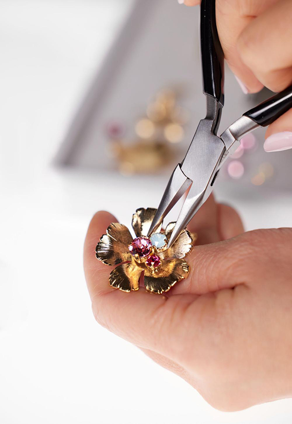 两朵金属花朵历经火烧工艺塑造成形。随后,戒指先经手工打磨抛光,再覆以金箔。在镶嵌白色和玫瑰色水晶后,最后再涂饰精美珐琅。在匠师的妙手点染之下,樱花绽放出绚丽色彩,朵朵栩栩如生。