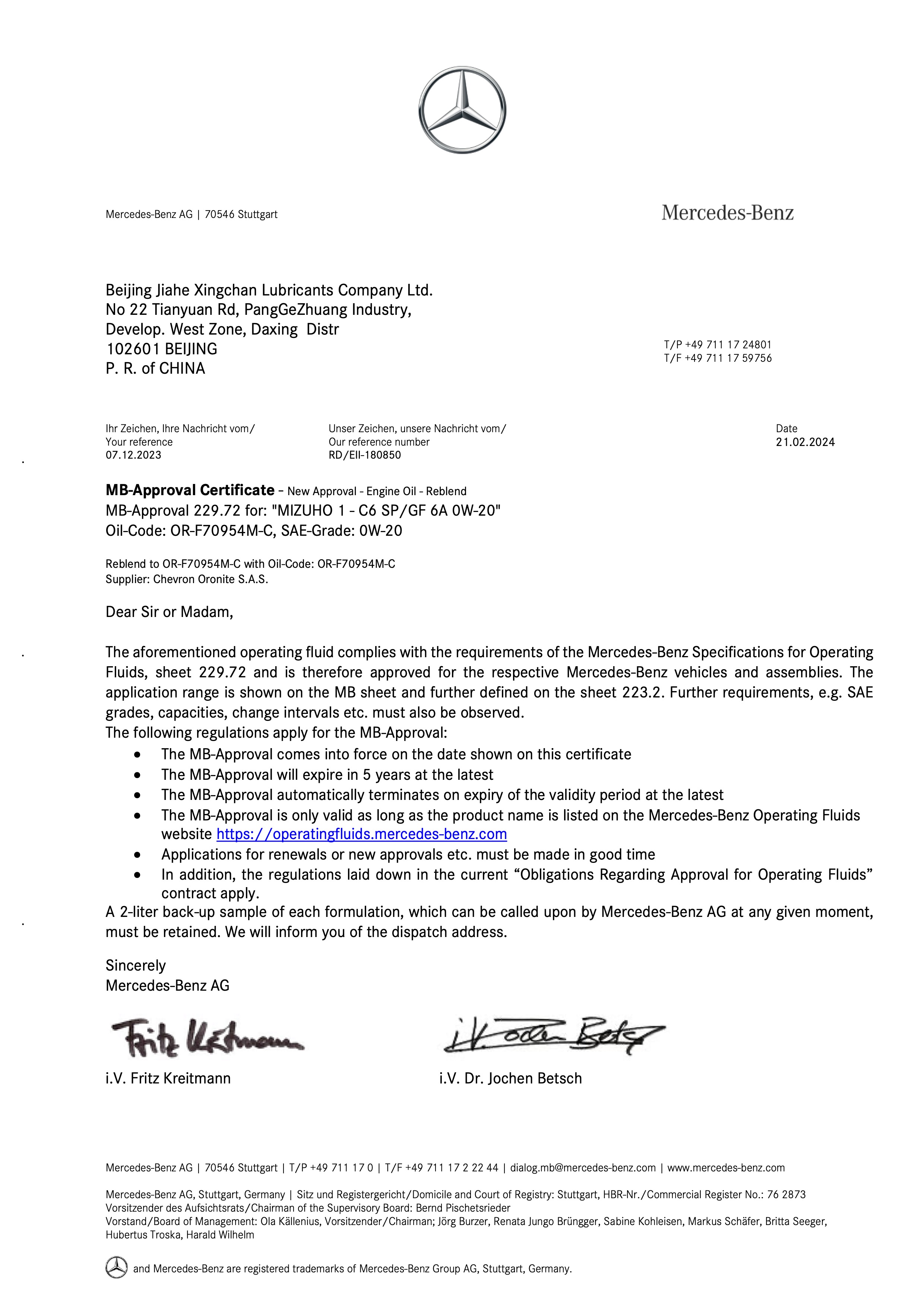 近日,嘉禾兴产公司出品的 MIZUHO 御用 1 号 0W-20 全合成发动机油获得奔驰 MB229.72 标准认证,这表明嘉禾兴产润滑油的品质已经处于世界一流水平。 为了保证产品的品质一直处于顶尖水平,奔驰对所需的零部件都制定了严格的标准,机油同样也不例外。 只有严格的标准要求,产品的质量才能精益求精,卓尔不群。