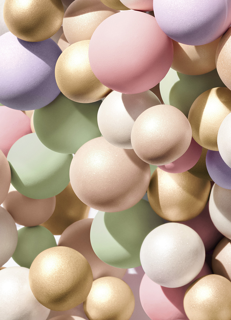 混合柔和的绿色、淡紫色和粉色以及珠光白色和金色珍珠粉球,提亮、均匀和修饰白皙肤色。