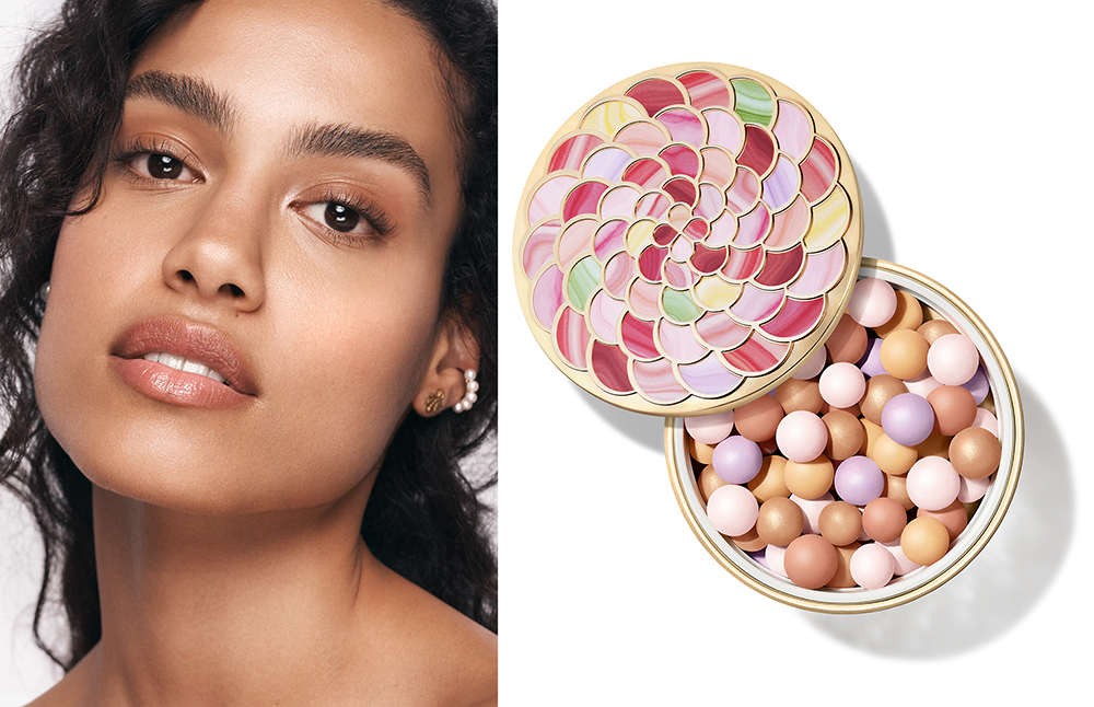 混合同色系哑光珍珠粉球以及淡粉色、金色和淡紫色珠光珍珠粉球,隐匿肌肤瑕疵,为自然肤色打造明亮妆效。