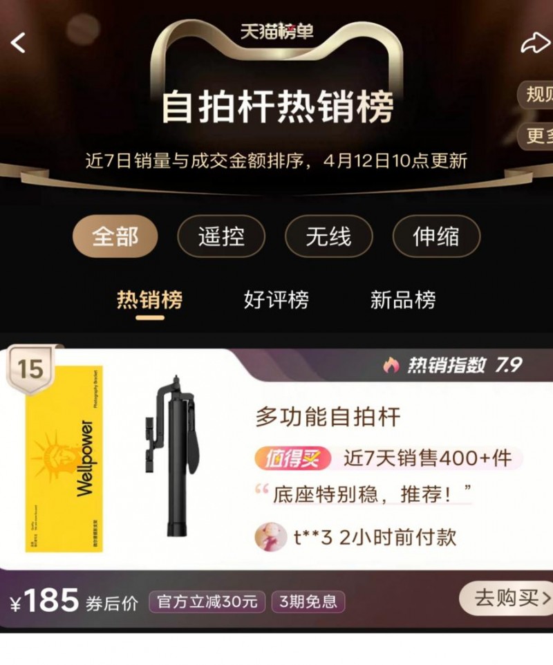 光影魔术师,配备补光灯的销量神器 产品附带的专业补光灯功能,使W&P自拍杆A21S在暗光环境下的表现格外出色,显著提升了拍摄效果,这项贴心设计助力其在同类竞品中脱颖而出,推动销量持续攀升。