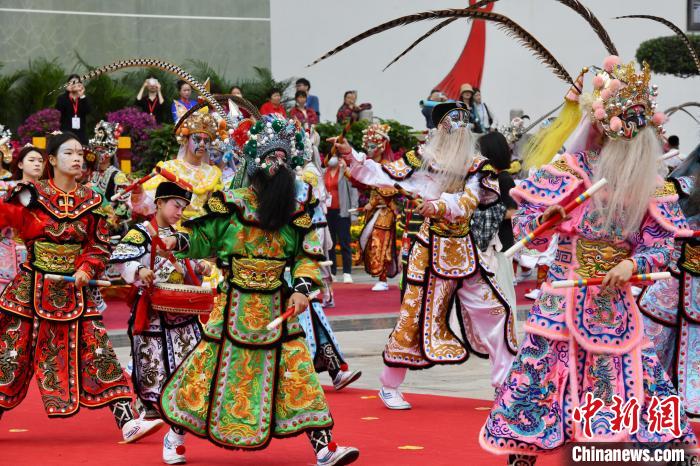 4月20日,潮汕英歌舞亮相“妈祖故里”福建莆田湄洲岛。当日,纪念妈祖诞辰1065周年大会暨春祭妈祖大典在湄洲妈祖祖庙天后广场隆重举行。中新社记者 王东明 摄