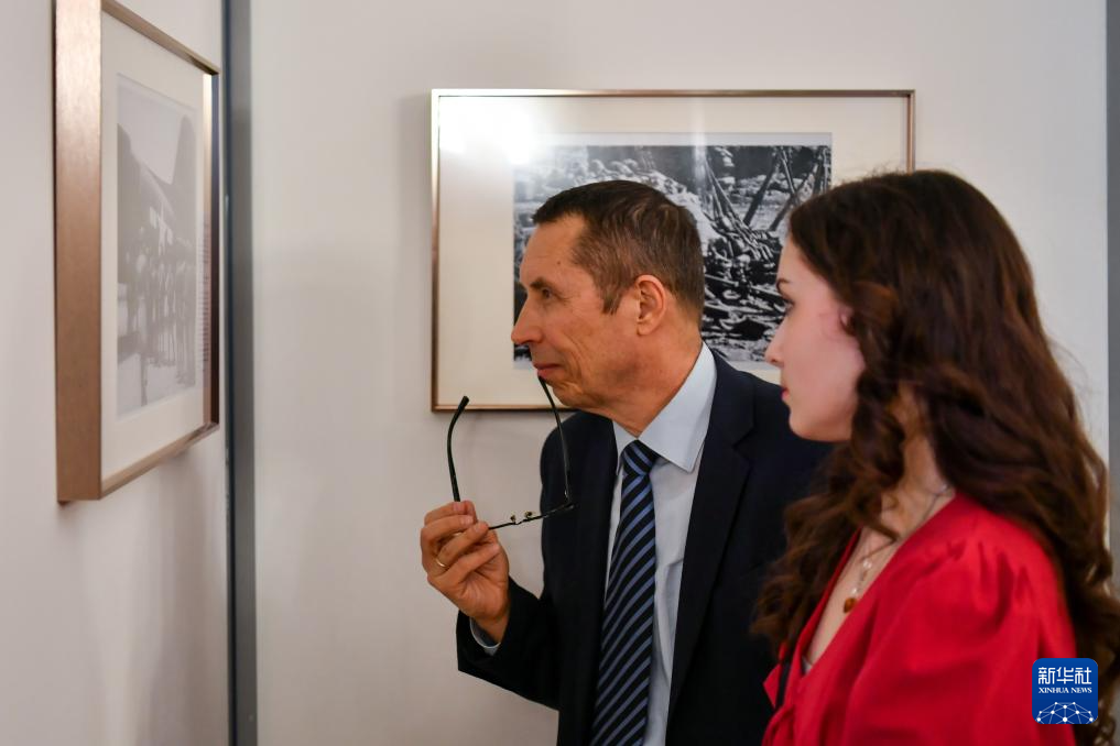 4月18日,在俄罗斯首都莫斯科,嘉宾参观纪念中国人民抗日战争暨世界反法西斯战争胜利80周年图片展。新华社记者 曹阳 摄