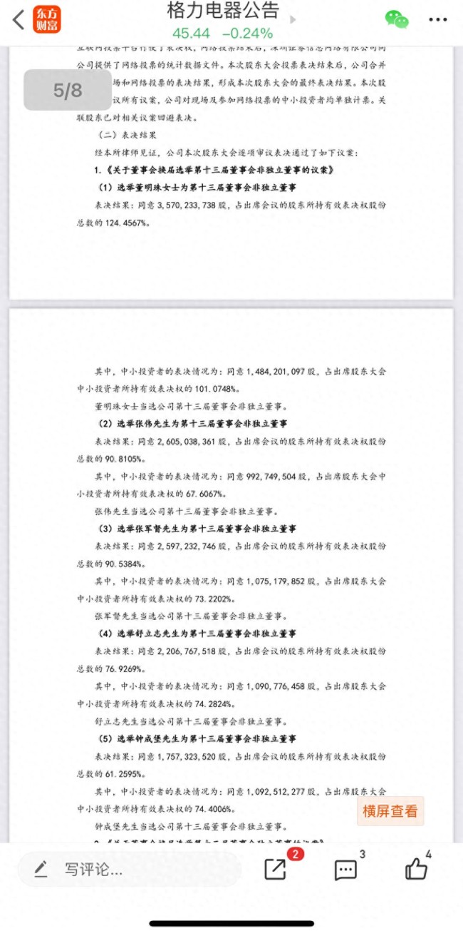 在股东大会投票环节,董明珠连任格力电器董事长获得了股东的大力支持。选举董明珠为第十三届董事会非独立董事的同意股份数达35.7亿股,占出席股东大会有效表决权股份总数的124.4567%;中小股东总表决同意股份数达14.84亿股,占中小股东有效表决权股份总数的101.0748%。