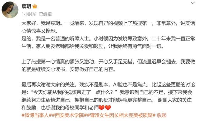 4月22日,西安美院聋哑女大学生宸玥因长相过于完美而受到质疑。有网友认为她的美貌不真实,像AI生成的一样。这一话题迅速登上热搜榜,引发广泛讨论。