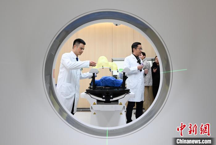 2月13日,浙江杭州,医生展示用于定位的CT模拟机,该设备可明确肿瘤位置,帮助医生制定精准治疗计划。当日,华东地区首台国产重离子医疗装置在浙江省肿瘤医院启用。重离子治疗技术是当今世界最先进的肿瘤治疗手段之一。中新社记者 王刚 摄