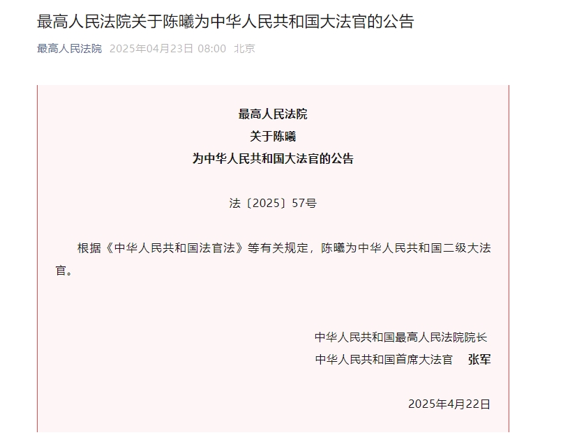 中新网4月23日电 据“最高人民法院”微信公众号23日消息,最高人民法院发布关于陈曦为中华人民共和国大法官的公告。详情: