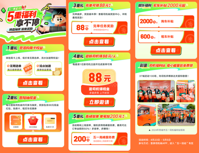 践行司机关爱行动外,滴滴送货也非常重视司机的做单体验。4月21日,滴滴送货上线五一促销活动,用户每日可领优惠券,最高立减30元。同时滴滴送货为司机师傅准备了五一高峰服务费、登录抽奖、任务返现等5重福利,让司机师傅旺季接单赚得更多。
