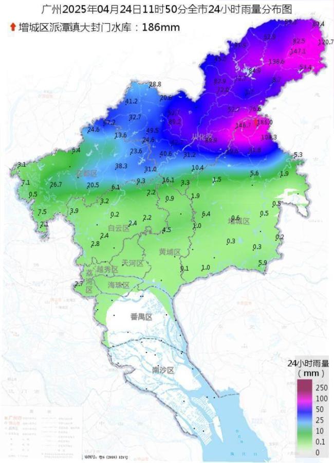 23日到24日早晨,珠三角北部出现了大到暴雨局部大暴雨,粤北和粤东部分市县出现了中到大雨局部暴雨,其余市县出现了分散雷阵雨。据统计,全省有13个镇街录得超过100毫米的大暴雨,41个镇街录得50至100毫米的暴雨。广州增城区派潭镇录得186毫米,潮州饶平县汫洲镇录得110.2毫米,韶关新丰县丰城街道录得102.1毫米。