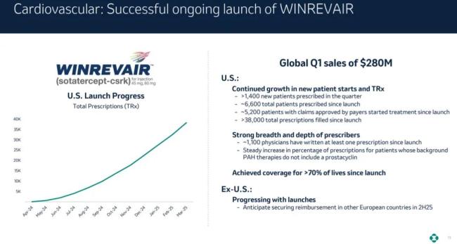 心血管领域,全球首创心肌肌球蛋白抑制剂Camzyos(玛伐凯泰)收入大幅增长(+89%),一季度全球收入1.59亿美元。目前,Camzyos已获批适应症为梗阻性肥厚型心肌病,治疗非梗阻性肥厚型心肌病III期研究未达到主要终点。该产品全球患者人数现达1.1万人,FDA近日更新该药物标签,减少维持期和禁忌症患者的超声心动图监测要求,有望继续扩大患者范围;