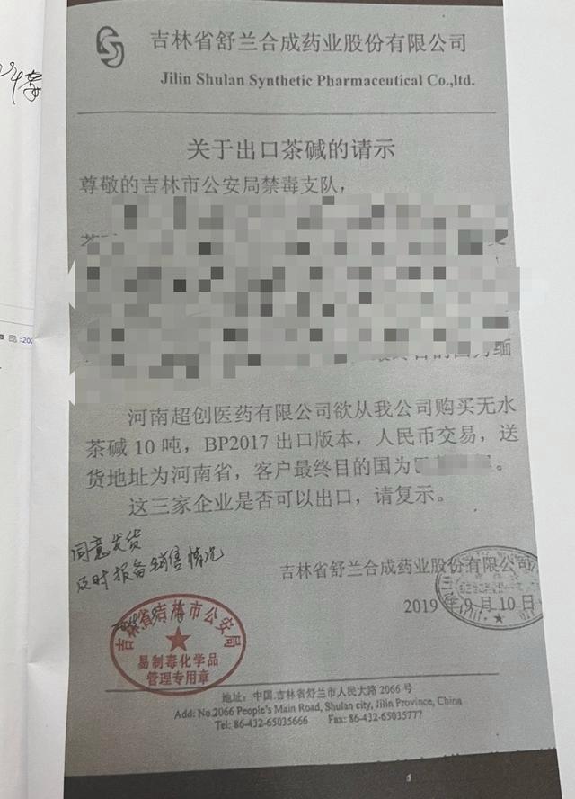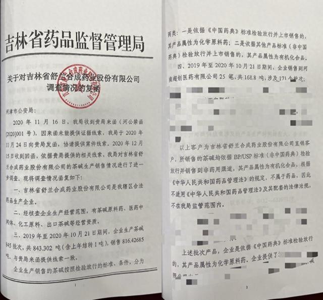 吉林药监部门给警方的复函称,涉案茶碱产品属性为有机化合品,不适用药品管理法律法规。茶碱是一种平喘药,也可加工成毒品咖啡因,但目前不在易制毒化学品名录中。舒兰合成药业成立于1989年,杨铁军现年53岁,是该公司销售部业务员。2020年12月22日,杨铁军被山西河津警方刑拘,所涉罪名为制毒。