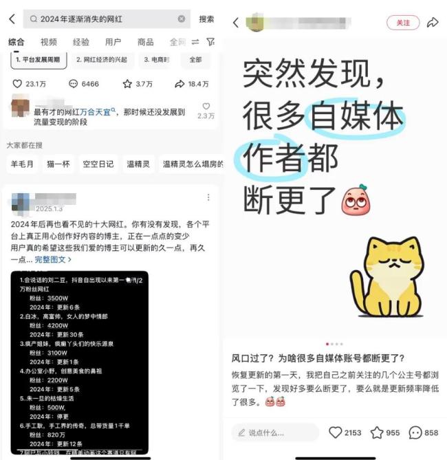 近年来,像敬汉卿一样减少更新甚至直接停更的视频创作者并不在少数。#2024年逐渐消失的网红#一度引发热议,这里边不乏千万粉丝级别的博主、成名多年的现象级网红。