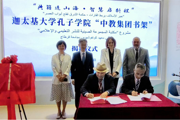 人民网突尼斯4月26日电 (记者薛丹、黄培昭)当地时间4月26日上午,中国教育出版传媒集团(以下简称“中教集团”)在突尼斯国际书展主宾国展区举办迦太基大学孔子学院“中教集团书架”揭幕仪式。