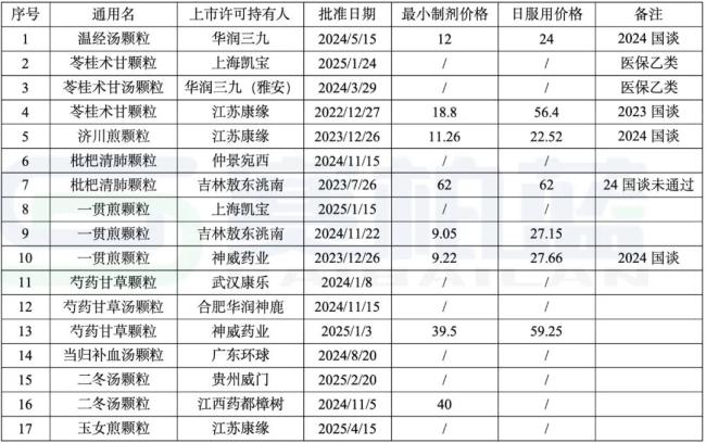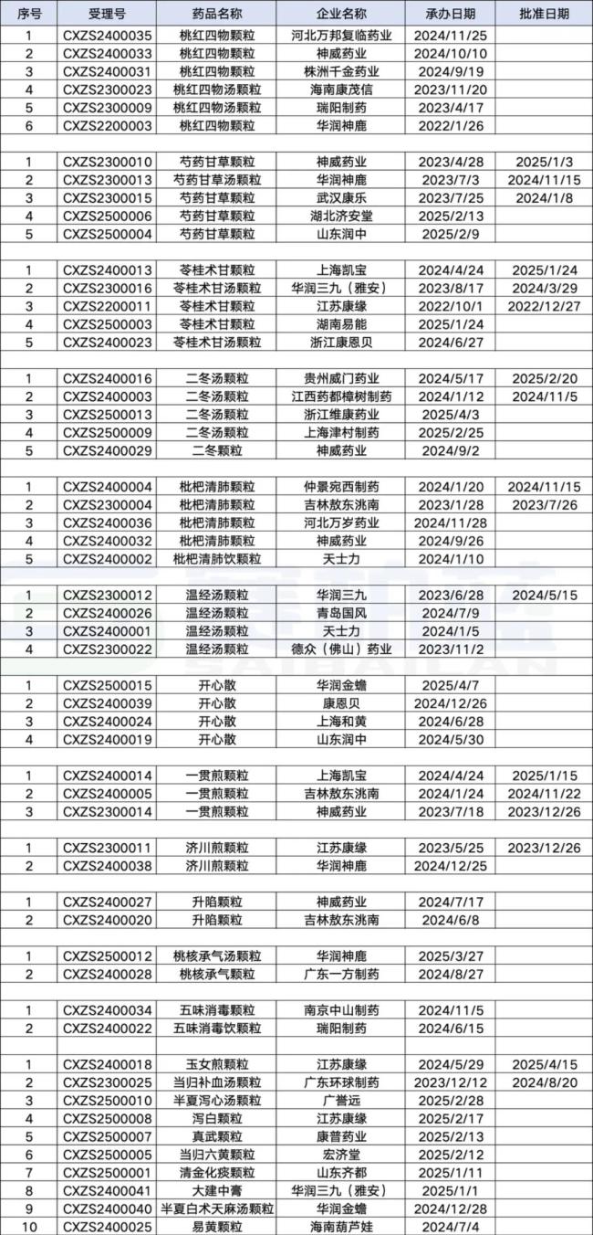 截至2025年4月,共有17家企业,9首方剂成功获批上市,其中2022年1家,2023年3家,2024年6家,2025年仅过去四个月,就有5家成功获批。