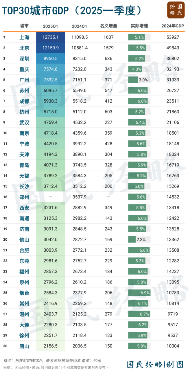 2025年是关键之年,国际经贸斗争、科技革命、产业变革以及房地产大变局使得城市竞争进入关键时刻。一季度主要城市GDP数据显示了一些变化。