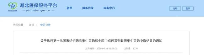 4月28日,湖北省医保局发布《关于执行第十批国家组织药品集中采购和全国中成药采购联盟集中采购中选结果的通知》,明确全省自2025年4月30日起执行全国中成药采购联盟中选结果(供应企业、中选价格、医保支付标准等见文末清单),首批中成药联盟集采扩围接续涉及的492个品规也将同步执行。