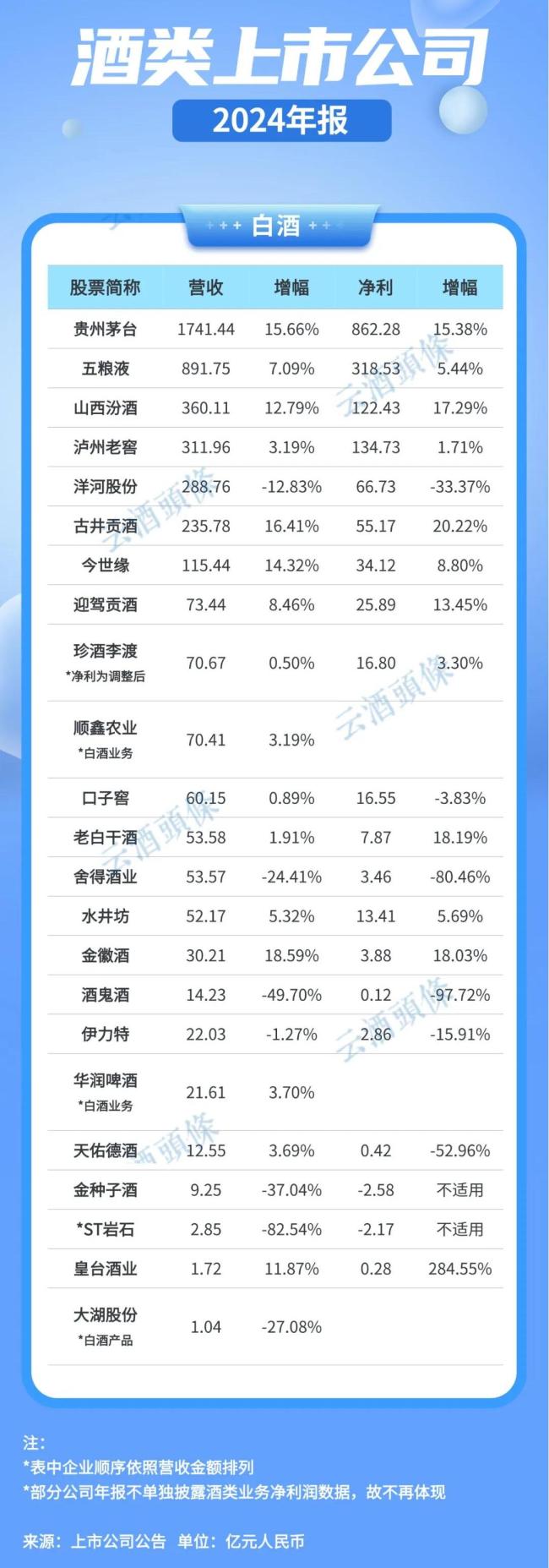 但在前不久披露的2024白酒上市公司年报中,另一组数据却揭示出结构性突围的可能——在营收增幅TOP5企业中,除贵州茅台、山西汾酒外,古井贡酒净利润增速超20%、今世缘营收突破115亿元、金徽酒营收创下历史新高达到30亿元。