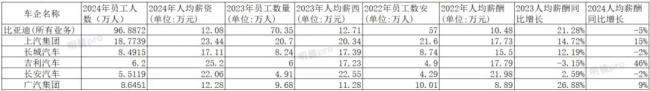 随着上汽集团在4月底公布了2024年财报,国内主力车企的年报也已经公布完毕。在年报中,各家车企都公布了其员工工资情况和员工总人数。根据这两个数据,我们可以简单地计算出上市车企集团的员工平均工资。在本文中,我们统计了比亚迪(含电子业务)、上汽集团、长城汽车、吉利汽车、长安汽车、广汽集团等6家车企在2024年的员工薪资数据。(注:本文数据来自财报,如有错误请联系修改))