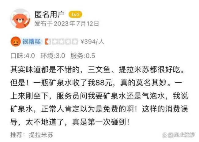 商家则表示,当时提供了酒水单,上面写明这款矿泉水是88元。消费者说要矿泉水时,应该已经看过酒水单并明白价格。如果顾客问了价格,他们也会明确回复或更换。但实际上,顾客什么都没问,还点了第二瓶。