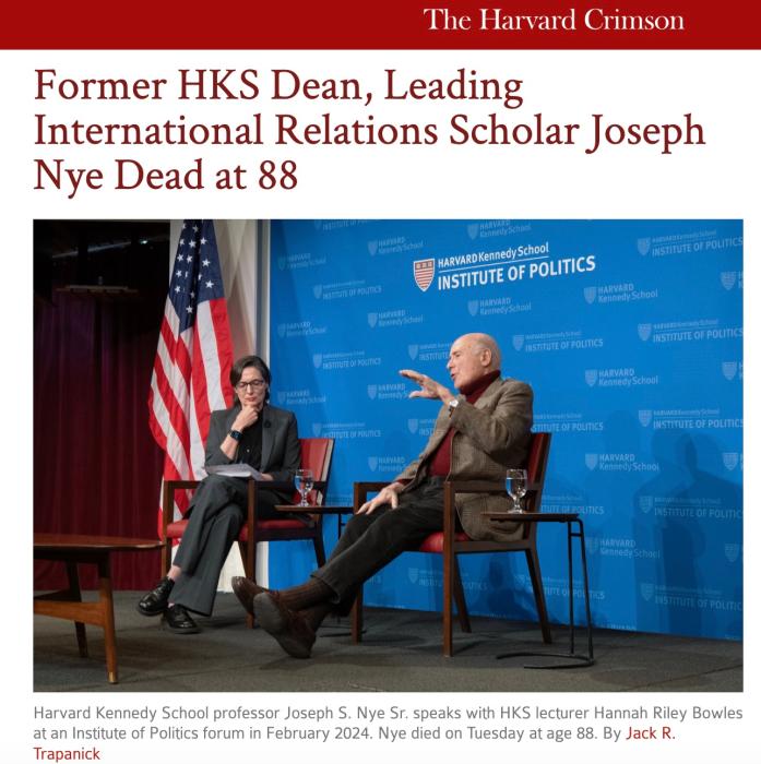 哈佛大学前校长劳伦斯·萨默斯在社交媒体平台上发表悼念约瑟夫·奈的贴文,称赞其是一位“渊博的学者”和“敬业的公职人员”。