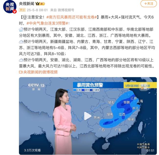 降水最强时段来临!狂风暴雨还可能有龙卷 多地发布预警!中央气象台于今天6时发布了暴雨、大风和强对流天气预警。预计今明两天,江淮大部、江汉东部、江南西南部和中东部、华南北部等地将出现大到暴雨,部分地区如安徽、湖北、江西、浙江、广西等地可能出现大暴雨。