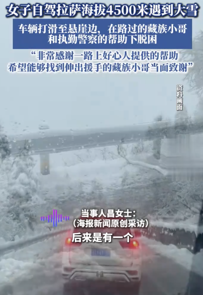 女子自驾拉萨车辆打滑至悬崖边。女子自驾拉萨(海拔4500米)时因大雪导致车辆打滑至悬崖边,在藏族小哥和执勤警察的帮助下脱困。