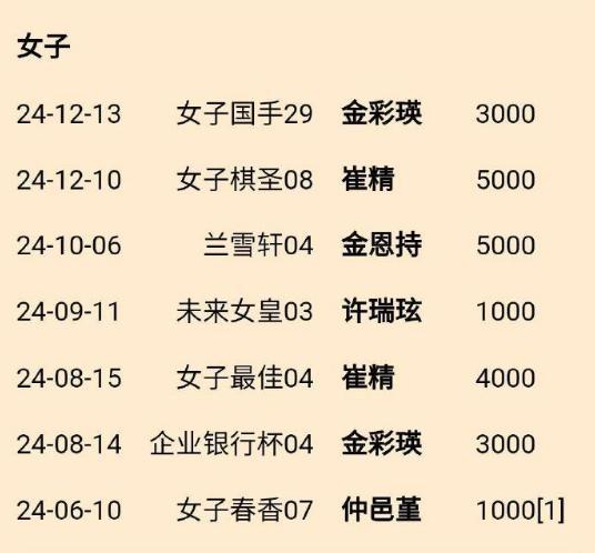 韩国国内女子棋战目前主要有七大头衔战,崔精拥有女子棋圣(冠军奖金5000万韩元)、女子最佳战(冠军奖金4000万韩元)两个头衔,金恩持目前拥有兰雪轩(冠军奖金5000万韩元)一个头衔。