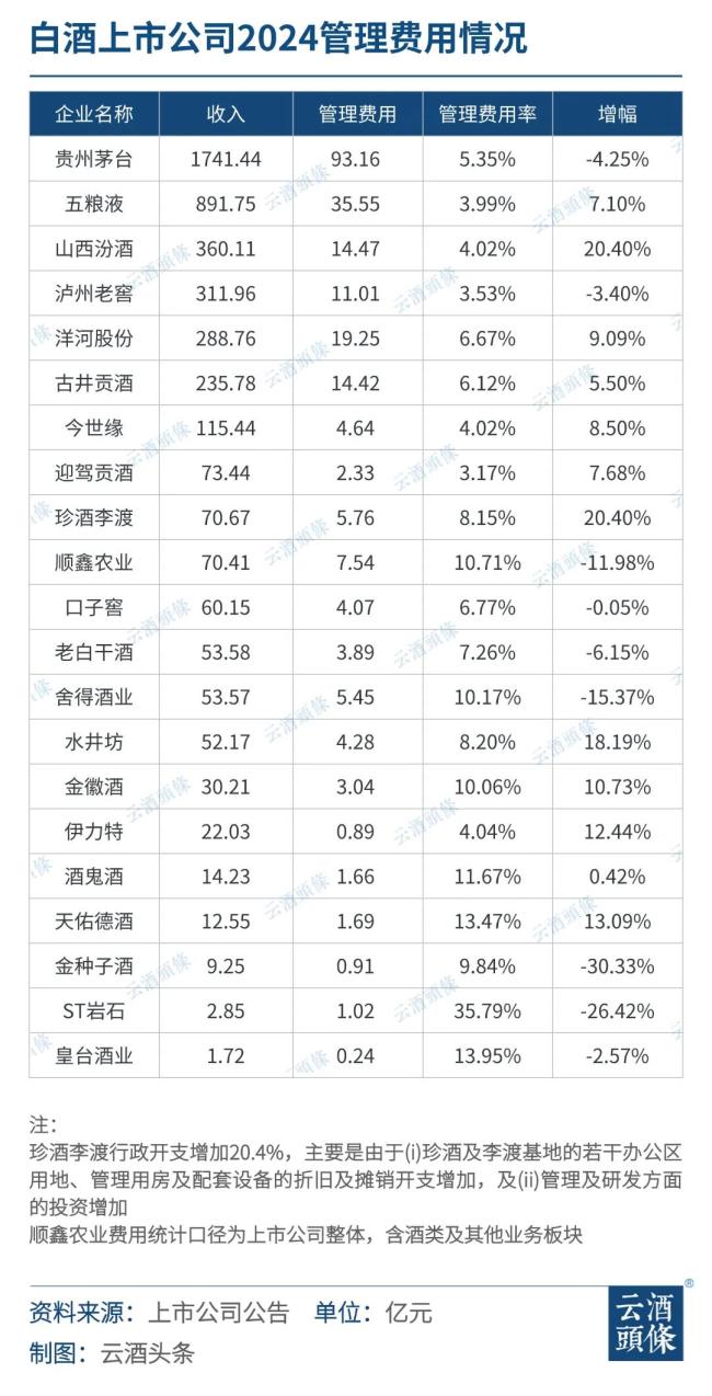 2024年,白酒行业持续“一降两升”发展态势,产量下降1.8%,销售收入与利润分别增长5.30%和7.76%,产业结构调整叠加存量市场马太效应,企业提质增效需求愈加凸显,从而得以在费用端清晰体现。