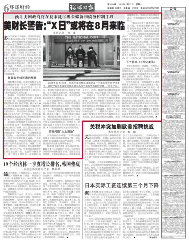 美国财政部通过暂停联邦雇员退休基金投资、赎回现有债务等“非常规措施”暂时维持支付能力,但这些工具的资金额度和时间有限。截至4月30日,大部分措施已被动用,剩余额度仅能支撑至6—7月。如果美国国会不及时采取行动提高债务上限,8月后政府将面临无钱可用的局面。