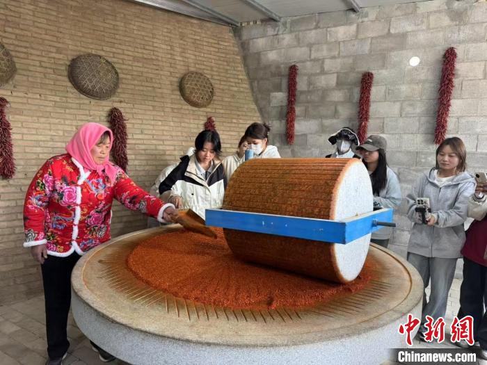 5月上旬,学生们在“辣婶子”的辣椒坊体验磨辣子。闫姣 摄
