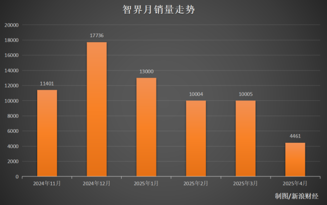 梳理智界品牌近半年来的销量数据发现,其在2024年12月销售为17736辆达到巅峰。但今年以来,销量数据下滑明显——1月为13000辆,今年2月和3月则分别为10004辆和10005辆。