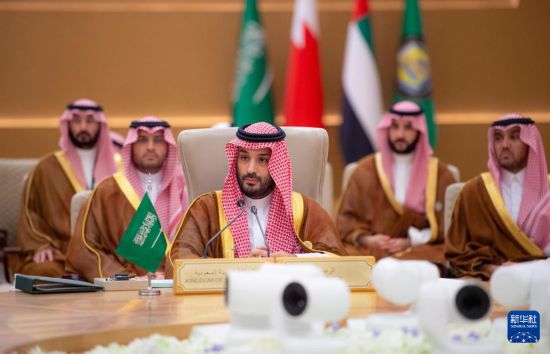 5月14日,在沙特阿拉伯利雅得,沙特王储兼首相穆罕默德(前)在海合会-美国峰会上讲话。新华社发(沙特通讯社供图)