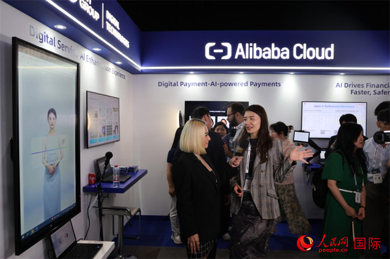 当地媒体在2025迪拜金融科技峰会的一家中资企业展厅采访。人民网 张志文摄