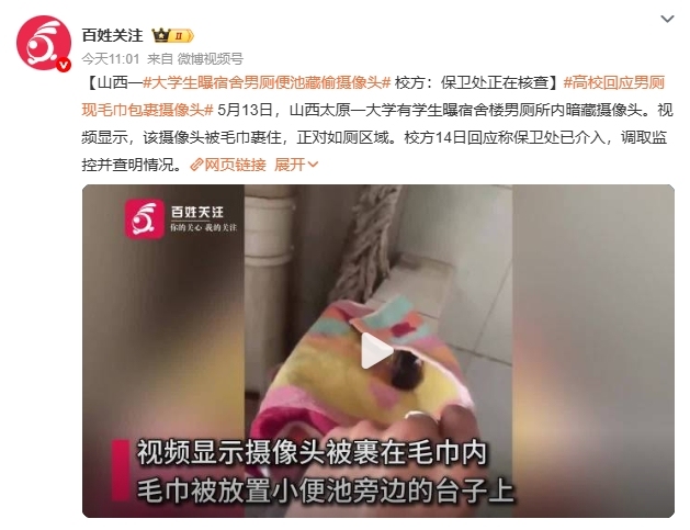 5月13日,山西太原一大学有学生曝宿舍楼男厕所内暗藏摄像头。视频显示,该摄像头被毛巾裹住,正对如厕区域。校方14日回应称保卫处已介入,调取监控并查明情况。